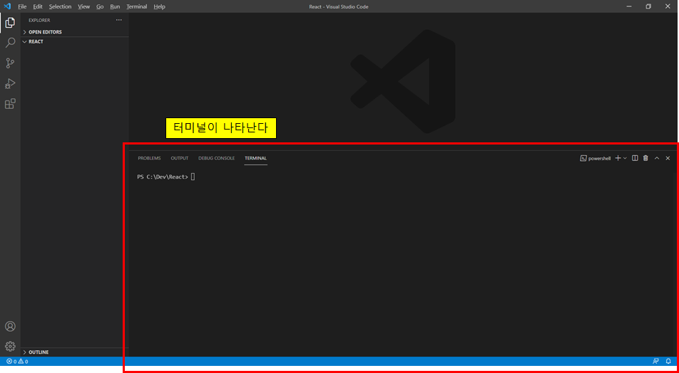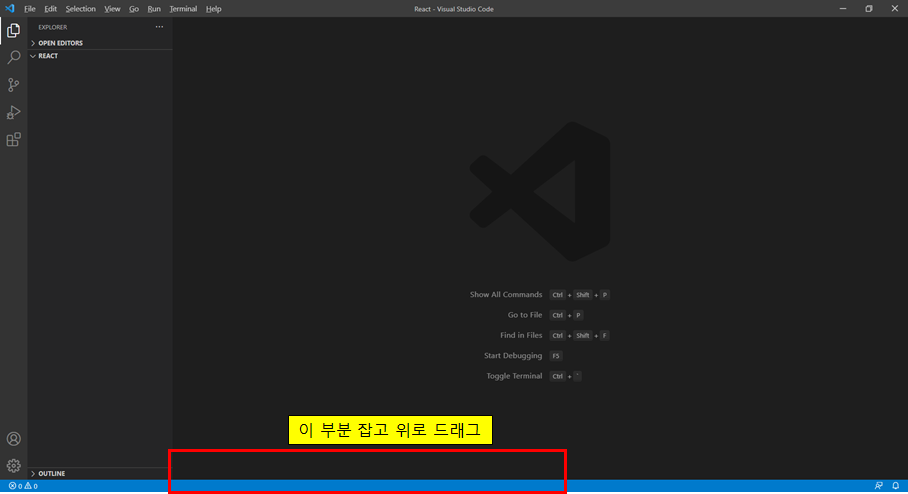 React 프로젝트 생성을 위해 VCS 터미널을 드래그해서 연다.