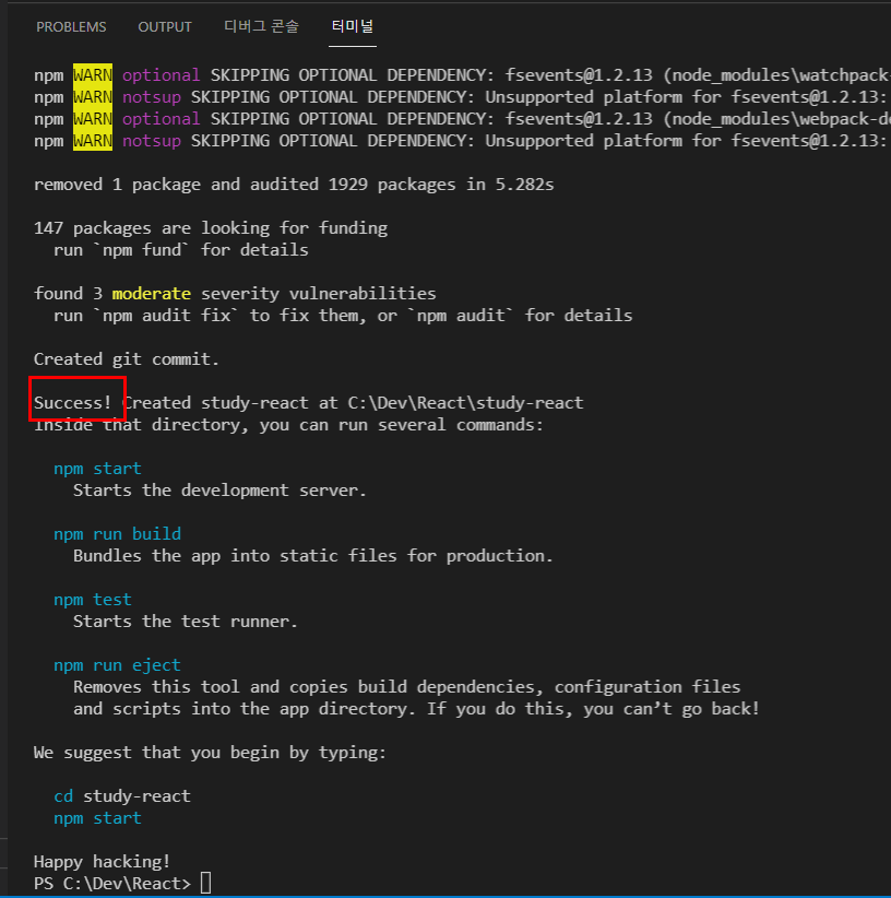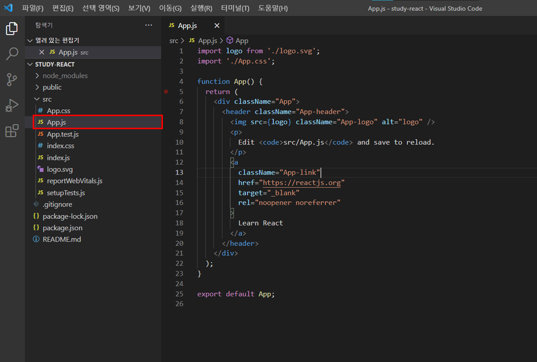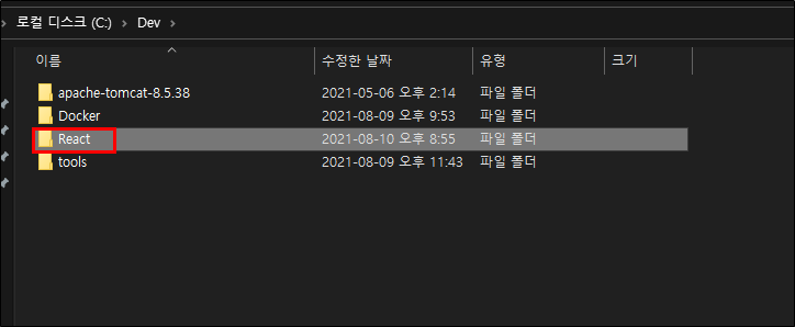 해당 경로에 react관련 파일들이 생성된 것을 확인할 수 있다.