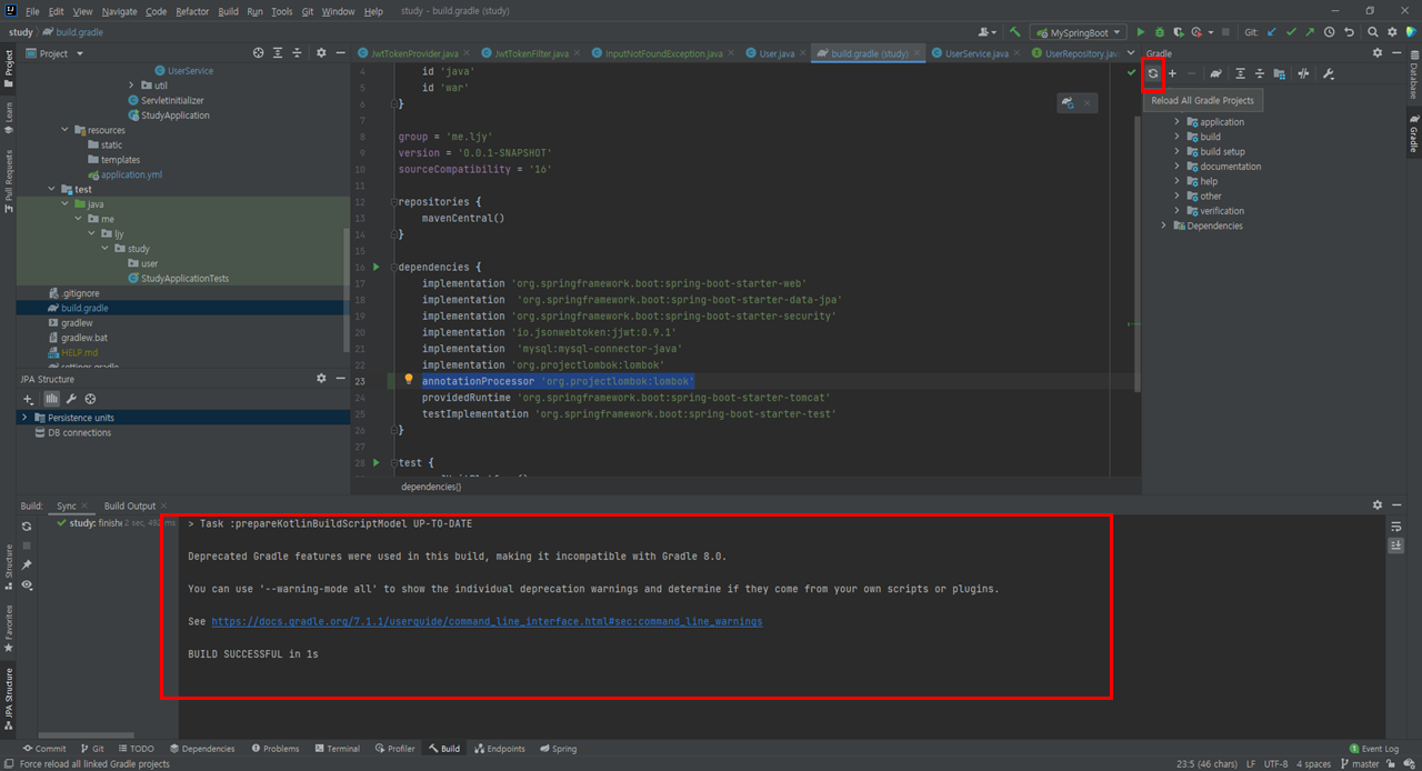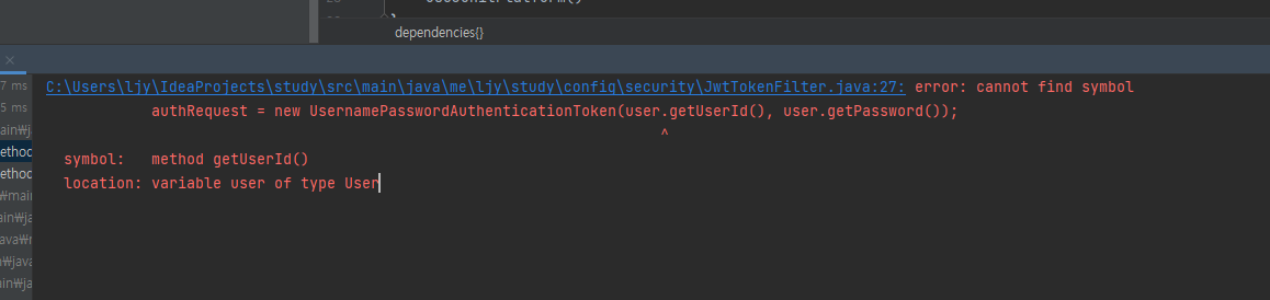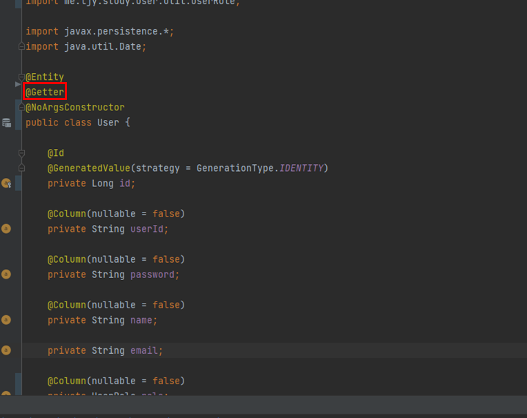 - 함수가 없다는 에러인것 같은데 실제로 User 클래스에 가보면 @Getter가 설정되어 있다.