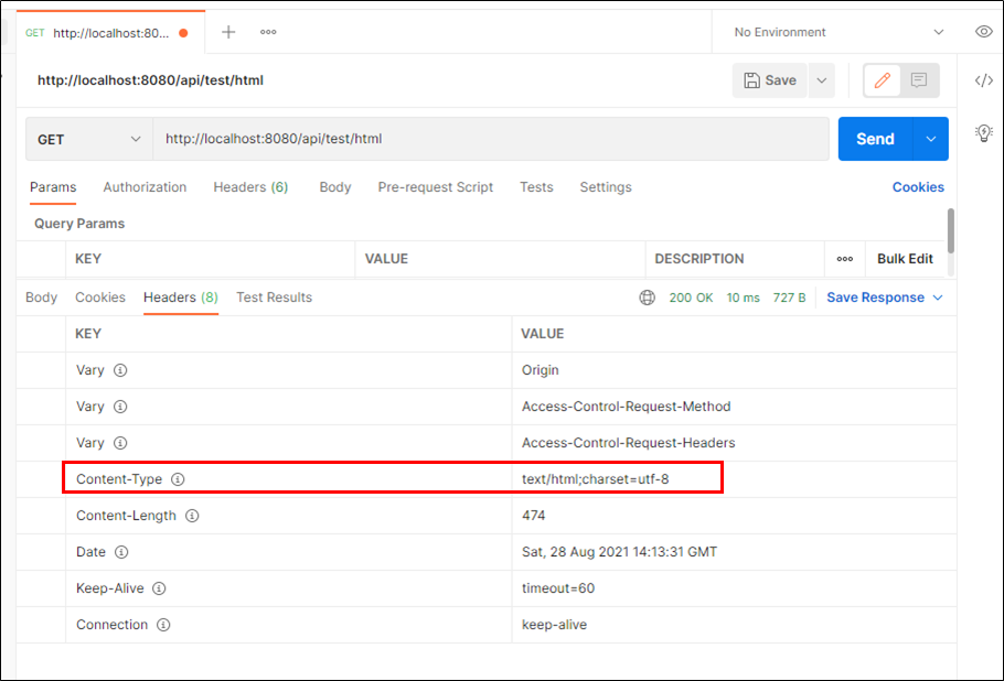 소스에서 설정한 대로 ContentType 및 인코딩이 설정되어 있다.
