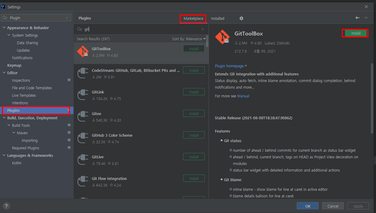 File > Settings로 이동해서 아래의 사진처럼 플러그인을 설치한다.