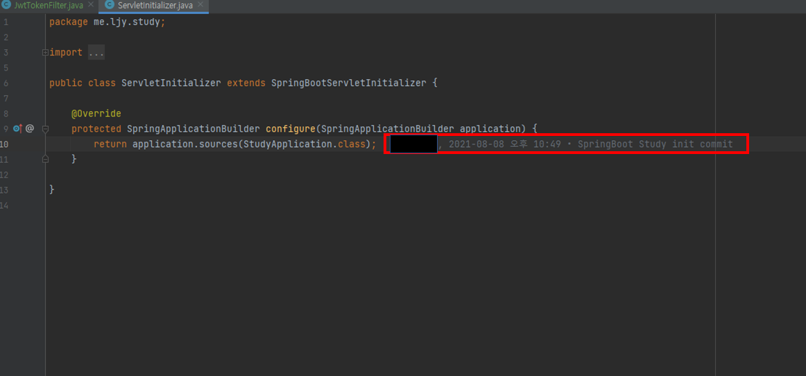 이제 git에 이력이 있는 파일에서 원하는 라인을 클릭하면 옆에 마지막 수정자, 수정일시, 커밋내역이 표시되게 된다.