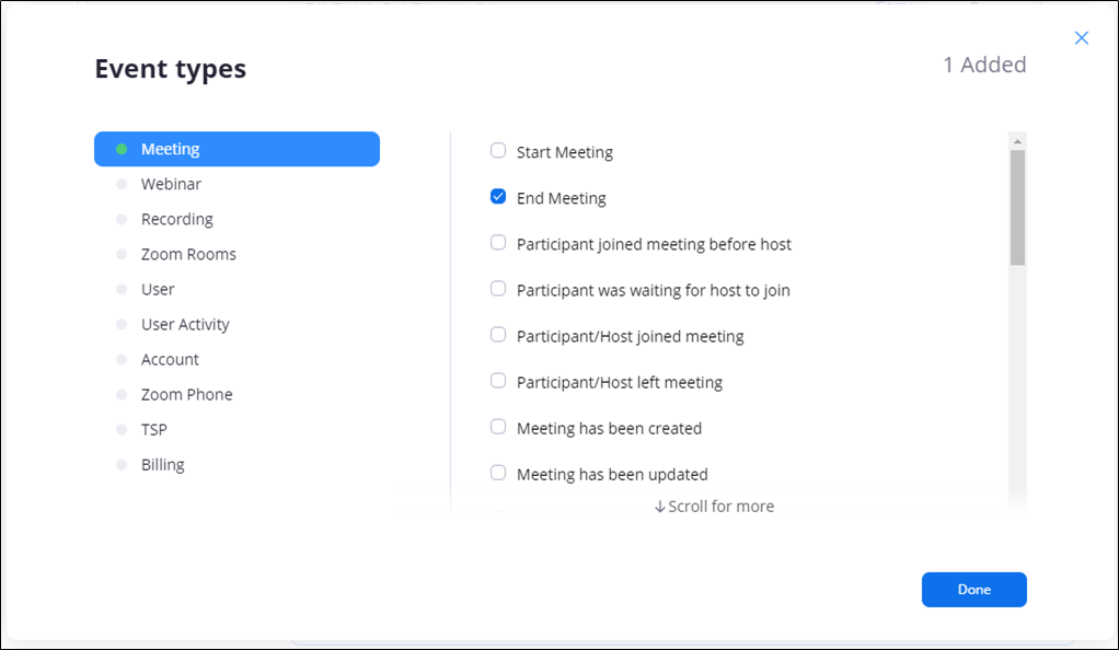 Event types 버튼을 클릭하면 아래와 같이 ZOOM 에서 제공하는 Webhook 이벤트들의 목록을 볼 수 있다.