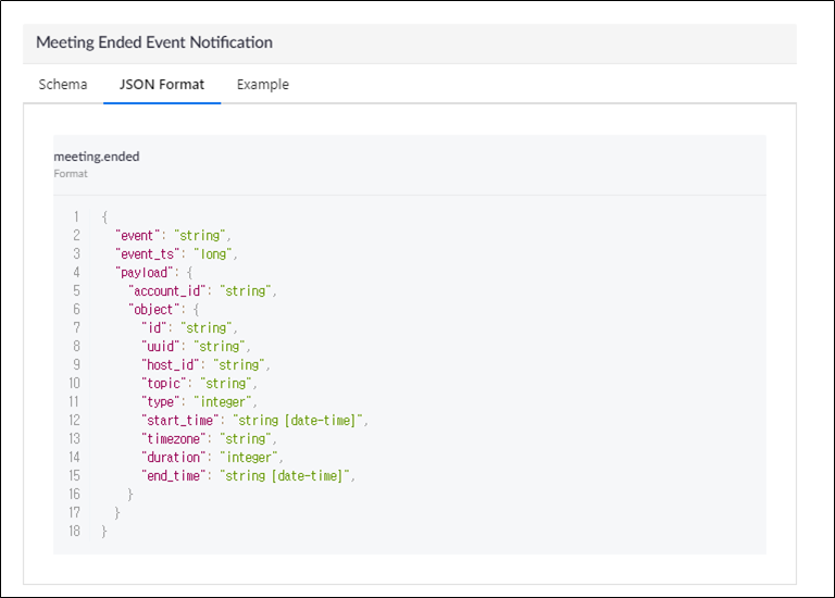 우리가 원하는 Meeting End Event에선 아래의 파라미터를 가지고 API가 호출됨을 알 수 있다.