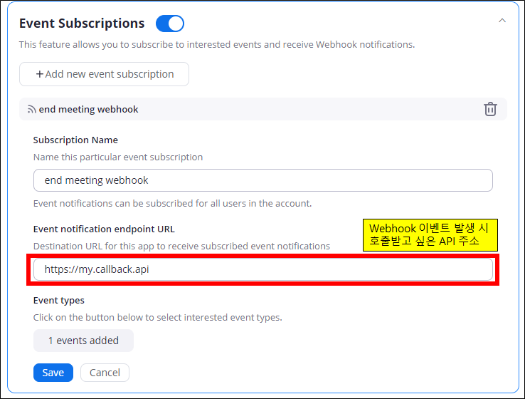 아래의 Event notification endpoint URL에