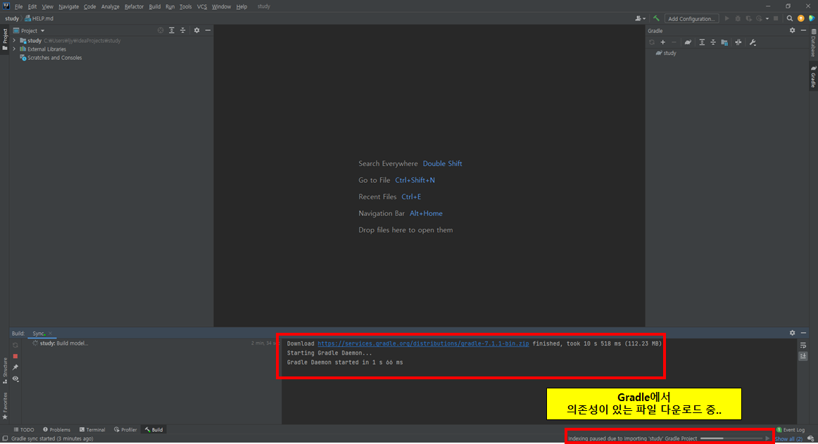 생성 후 하단을 보면 Gradle에서 의존성에 필요한 파일을 다운로드 중이다.