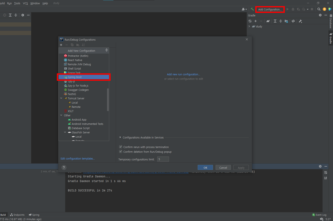 우측 상단 Add Configuration... 선택 후 나오는 팝업에서 + 버튼 > Spring Boot를 클릭한다.