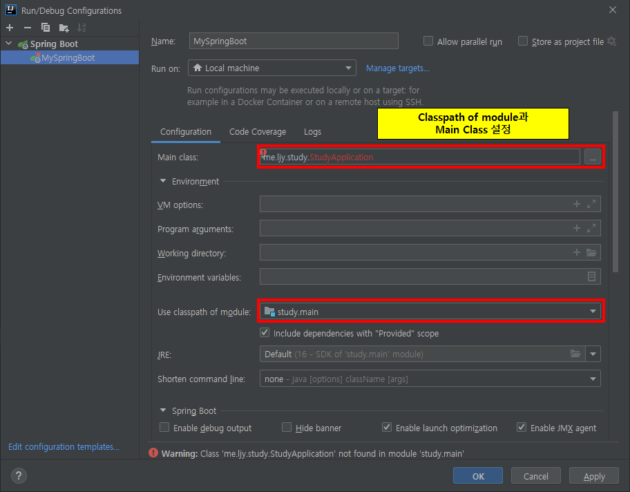 ※ Main Class가 빨간색으로 표시되었는데 무시하고 OK를 클릭합니다.