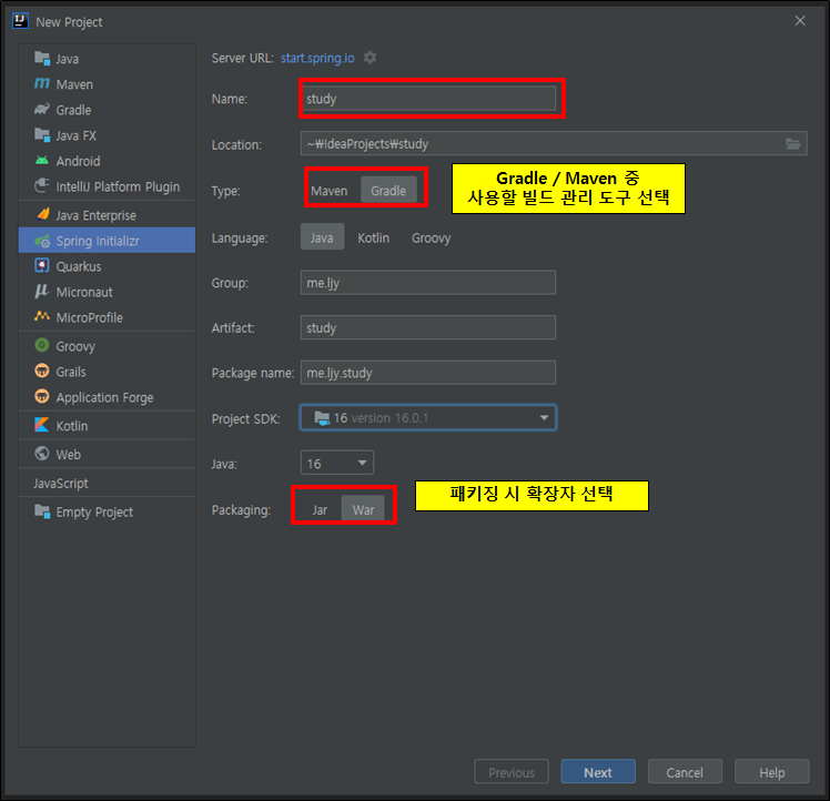 위의 사진에서 Gradle / Maven이 무엇인지 모르겠다면 Gradle을 선택하는 것을 추천한다.