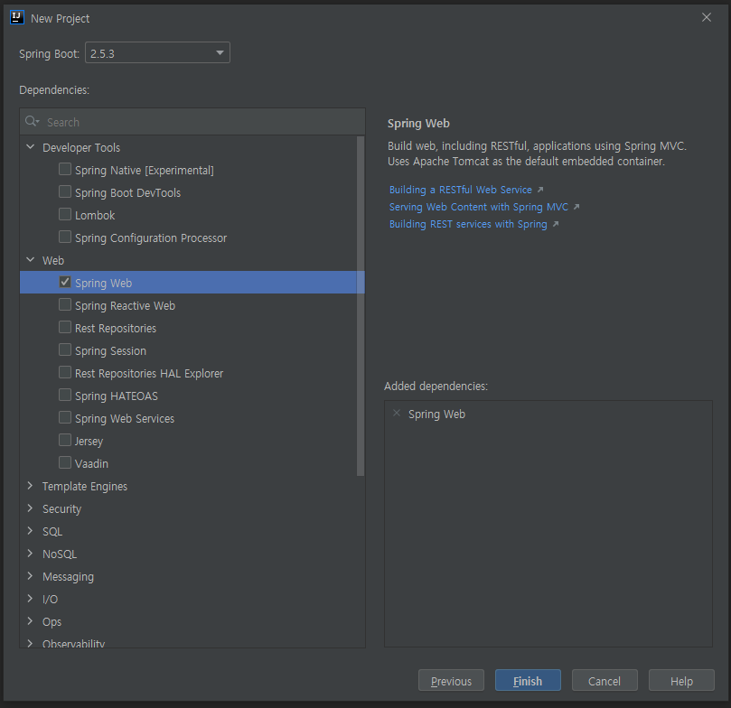 여기서는 스터디를 위해 가장 기본인 Spring Web만을 선택한 후 Finish를 클릭한다.