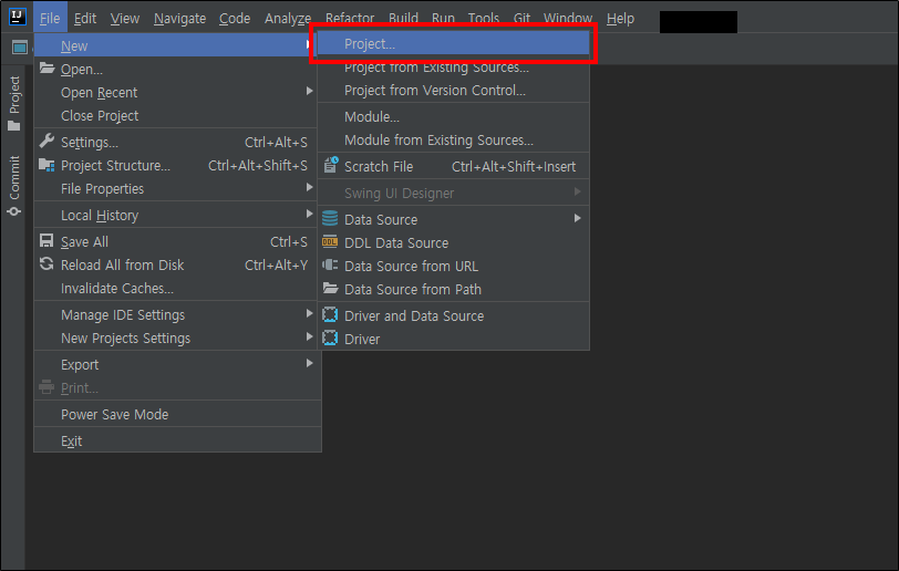 File > Project...을 클릭해 새 프로젝트를 생성합니다.