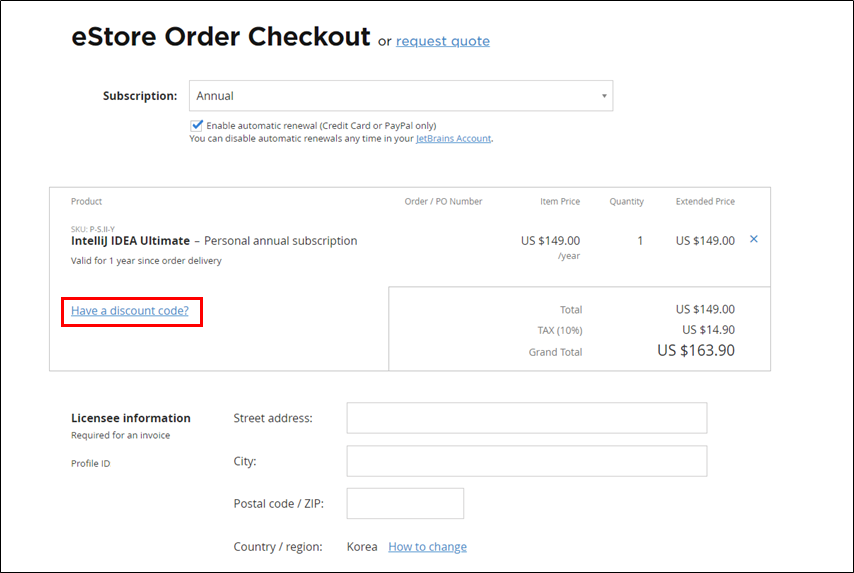 3. 주문 페이지에서 Have a discount code? 를 클릭한다.