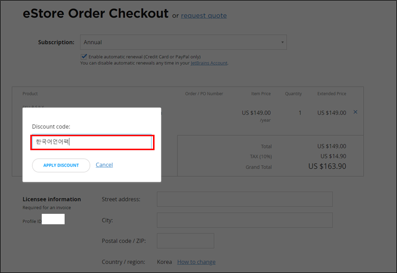 4. 할인코드에 한국어언어팩 을 입력 후 APPLY DISCOUNT 를 클릭한다.