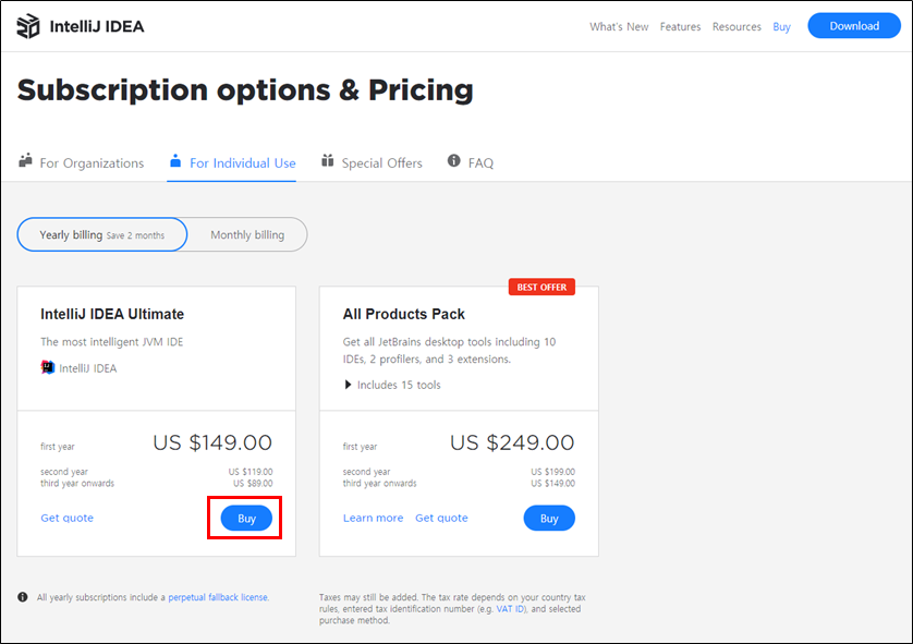 1. 아래의 Intellij Store로 이동한 후 Buy 버튼을 클릭한다.